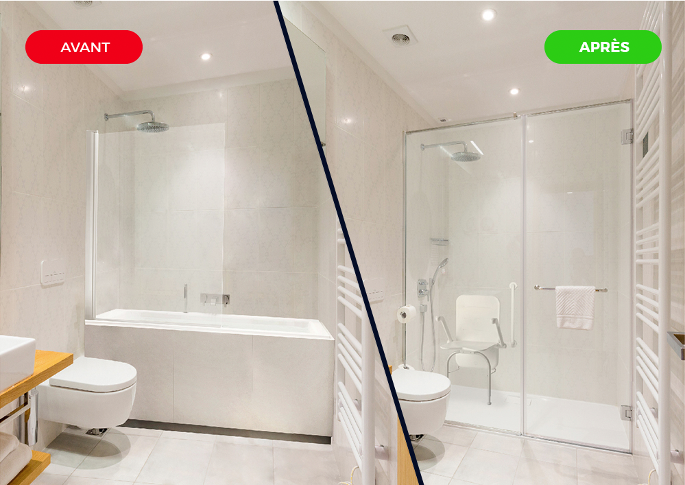 Retrouvez le plaisir de prendre une douche en toute sécurité : receveur plat, sol antidérapant, siège et barres de maintien.